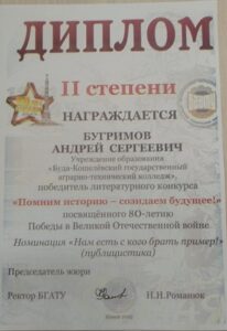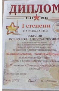 Бугримов Андрей Сергеевич получил  диплом II степени, в номинации «Помнить, чтобы жить!» -Забелов Всеволод Александрович  награжден дипломом I степени в номинации поэзия.