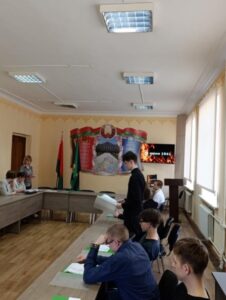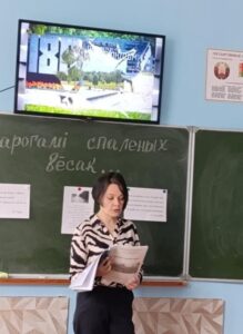 Выкладчык Скарына Л.В. сумесна з групай 85м першага курса правяла адкрытае мерапрыемства «Дарогамі спаленых весак…” з мэтай  паглыбленне ведаў навучэнцаў  па гісторыі Вялікай Айчыннай вайны; развіццё цікавасці да гістарычнага мінулага нашай краіны; паказ праз успаміны і вершаваныя творы  пісьменнікаў  антыгуманную сутнасць фашызму, вастрыню маральнага супрацьстаяння ў  змаганні; выхаванне пачуцця патрыятызму, павагі да тых, хто абараніў мір, каго вайна пазбавіла шчаслівага дзяцінства.